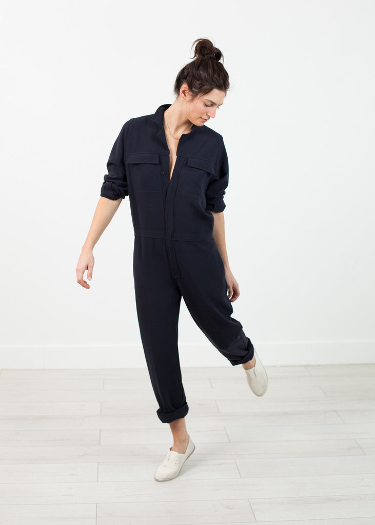 A modern one piece for the riveters at heart. The Worker Jumpsuit is utilitarian and adaptable, with sophisticated structure. Wide collar, classic cuffs, snap button and front zip closure. Side angled pockets. Harvey Faircloth. Color Navy. Made in U.S.A. Lana is wearing a size 2.